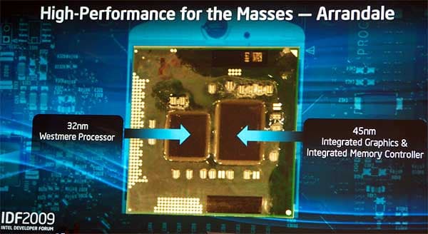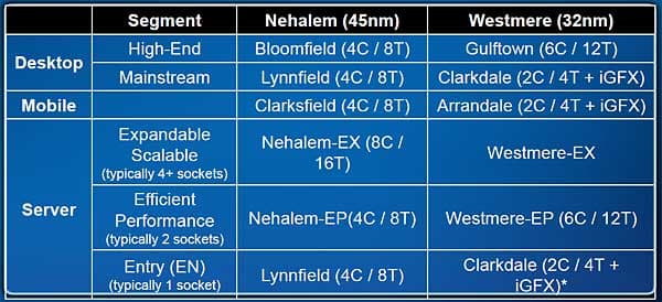 Старший вице-президент Intel и генеральный директор Intel Architecture Group Шон Малони (Sean Maloney) рассказал, что на смену текущей линейки настольных процессоров на базе архитектуры Nehalem идет ядро под кодовым именем Westmere. Отличительными особенностями Westmere является использование 32 нм техпроцесса, интегрированное в общий корпус графическое ядро и поддержка специального набора инструкций, ускоряющих AES-шифрование. Версия Westmere для настольных компьютеров носит кодовое имя Clarkdale, а для мобильных решений — Arrandale.