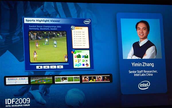 На сцену выходит Брайн Девид Джонсон и Ямин Жанг, которые представили технологию отслеживания отдельных объектов в видеопотоке — футболист, мяч, ворота и т.д. в итоге формируется база объектов и пользователь может делать нужную ему выборку, например, не смотреть все 90 минут футбольного матча, а посмотреть лишь пять минут с процессом забивания мяча в ворота. Вот так можно мол экономить время, выбирая именно нужную информацию. Нам представляется сомнительной польза для широких масс зрителей — ну что это такое, смотреть лишь результат атаки форвардов, а как же сама игра? Зато для аналитиков такой инструментарий действительно может оказаться очень полезным, хотя бы в смысле экономии времени.