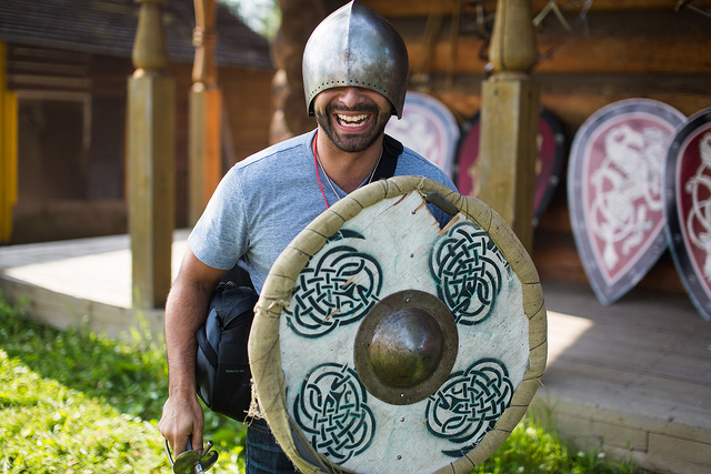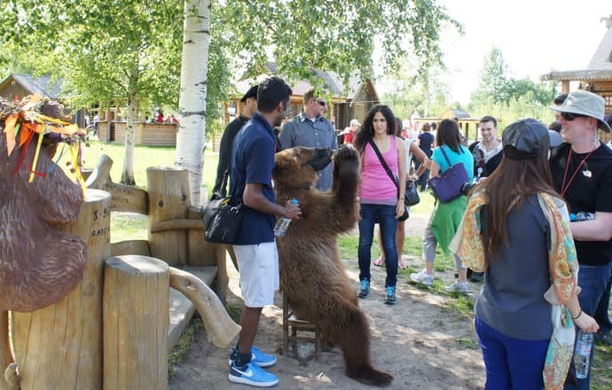 На второй день вечером участников повезли в, как это модно говорить, этно-комплекс «Шуваловка» — небольшой парк развлечений, декорированный под русскую деревню. Развлечений там было действительно много, включая кидание валенками, стрельбу из луков, перетягивание канатов… там же был и живой медведь!