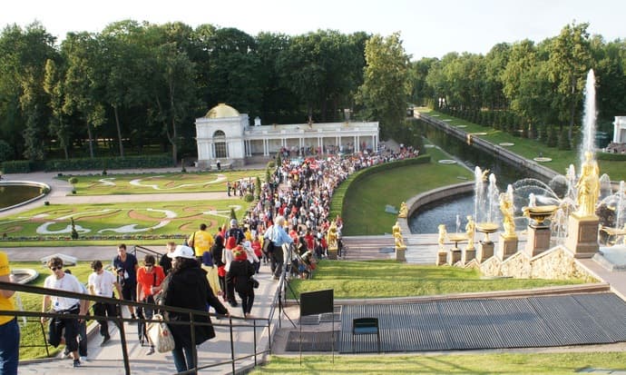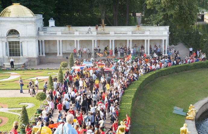 А после этого всех участников повезли в Петергоф, где после краткой экскурсии по дворцу и парку для них включили знаменитые фонтаны.