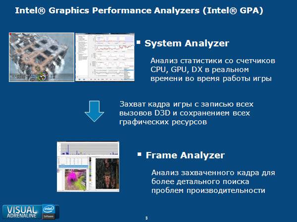 Вторым представленным подробно проектом был Intel Graphics Performance Analyzers — инструмент для анализа производительности графических приложений. Многих врасплох застает очередной обзор рынка графических решений ПК, на котором неизменно лидирует компания Intel. Да, дискретных видеоускорителей компания не выпускает, но зато продает столько чипсетов (в т. ч. с интегрированной графикой), что в общей массе компьютерных систем именно графика Intel чаще всего отвечает за вывод картинки на монитор (или иное устройство отображения) пользователя. При этом производительность интегрированной графики никогда не была потрясающей, и если пару последних лет NVIDIA и особенно AMD/ATI демонстрируют нечто мало-мальски интересное в 3D-играх, то чипсеты Intel заметно уступают по скорости и им. В то же время, создатели компьютерных игр безусловно заинтересованы в том, чтобы огромная масса потенциальных покупателей реализовала свой потенциал в плане покупки их игр, что произойдет с гораздо большей вероятностью в том случае, если эти люди смогут играть на имеющемся видеоадаптере своего ПК/ноутбука.