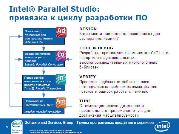 Актуальность первого вряд ли может вызывать сомнения. Сейчас, когда ориентация производителей процессоров самого разного типа на многоядерность очевидна, очевидна и необходимость максимально распараллеливать вычислительные алгоритмы, так как в обозримой перспективе поднять скорость их выполнения в разы можно будет только таким образом. Intel активно работает с программистами, обучая их и предоставляя соответствующие библиотеки и средства разработки (а массовость этот процесс приобрел еще во времена выпуска Pentium 4 с технологией Hyper-Threading — вот она, «бесполезная псевдомногопроцессорность»). Вполне естественно, что на текущий момент компания предложила и полноценный пакет приложений для распараллеливания вычислений, поиска специфических ошибок и узких мест — Intel Parallel Studio.
