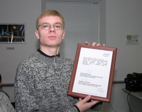 Итак, время подводить итоги. Все наши собеседники выделили вопрос участника конференции под ником «ellarion» про то, не будет ли конкурировать Wi-MAX с сотовой телефонией. Поздравляем нашего читателя. Жаль, что он не смог получить компьютер лично из рук Кристиана Моралеса и Гордона Грейлиша, посему вручением руководил представитель компании Intel Всеволод Семенцов, который передал Кириллу как сам компьютер, так и почётную грамоту.