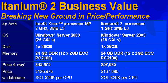 Напомню, что одним из главных тезисов, продвигаемых на презентации чипов с ядром Madison, стало преимущество новых процессоров совсем не в низкой стоимости систем, хотя, этот фактор также болезненно ударил по производителям RISC-процессоров; более важным фактором, называлось соотношение производительность/цена, что свело конкуренцию с современными процессорами IA64 к достаточно рискованной затее.