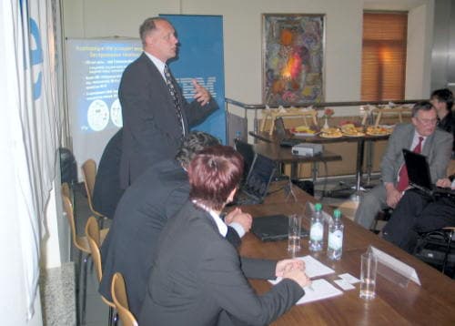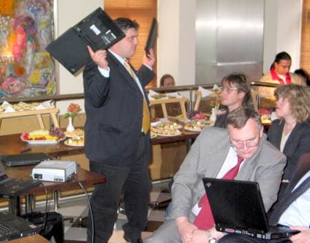Интересно было наблюдать, как в процессе презентации Григорий Давыдов, менеджер по продажам мобильных систем IBM, сначала уронил от груди один из ноутбуков серии ThinkPad, а затем походил по нему ногами, после чего, поднятый с пола ПК продолжал работать как ни в чем не бывало. Похвальная надежность, при этом, речь шла все же не о специально армированном изделии, но о серийной модели.