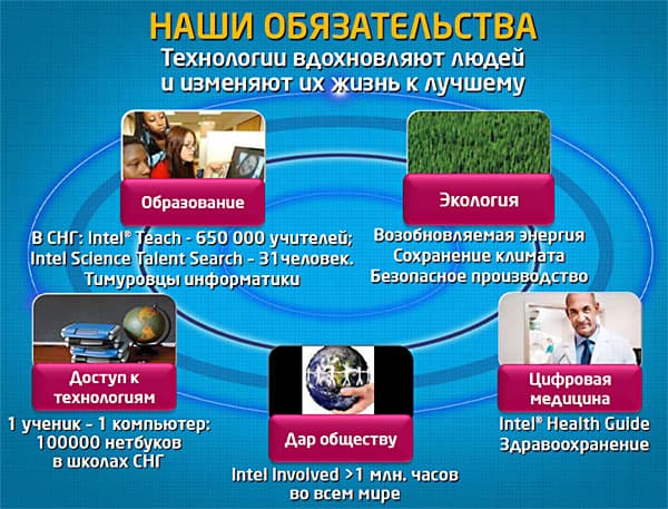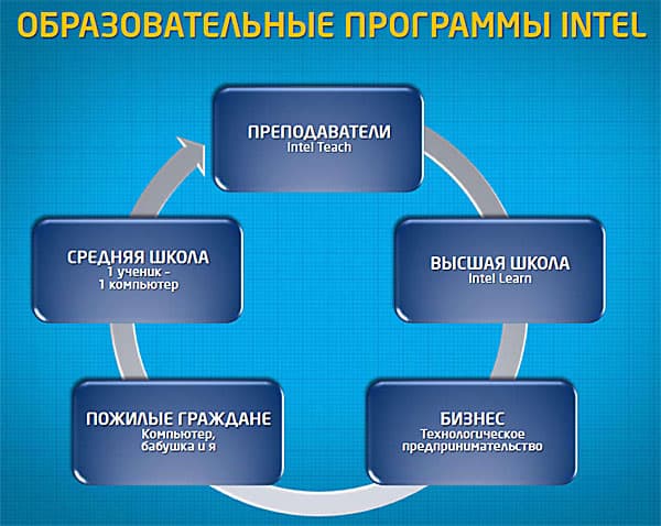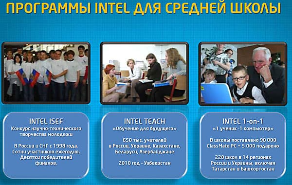Ежегодно Intel вкладывает в образовательные программы 100 млн. долларов. За прошедшие годы при поддержке Intel было обучено по программе Teach более 60 млн. преподавателей в 60 странах. Где было поставлено более 2 млн. компьютеров класса ClassmatePC, опять же при поддержке Intel. В 70 странах в 1000 университетах более 100 000 студентов-педагогов прошли специальное обучение по программе Learn.