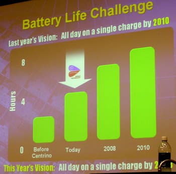 В нем применена новая более прогрессивная микроархитектура кэш-памяти — Intel Smart Cache, позволяющая обоим ядрам хранить и использовать общую информацию и даже обмениваться ею (включая когерентность кэш-памяти), а также индивидуально управлять энергосбережением каждого из вычислительных ядер, не теряя при этом доступ к общей информации, хранящейся в кэш-памяти. Новое ядро Intel будет поддерживать все модные технологии — SSE3, VT и AMT (Virtualization и Active Management)… Не будет здесь лишь Hyper-Threading и EM64T, которые принесены в жертву заботе о снижении энергопотребления. Тепловой пакет нового процессора ожидается на уровне около 25 ватт и утверждается, что пакет новой платформы Napa в целом не будет выше такового у платформы Sonoma. Более того, Intel не исключают и того, что процессоры на «мобильном» ядре Yonah будут использоваться не только в определенных сегментах рынка настольных компьютеров (для этого уже разработаны и демонстрируются соответствующие мини-концепты домашнего и офисного ПК), но даже в компактных экономичных серверах. Что касается среднего времени автономной работы ноутбуков, то ее неуклонно пытаются повысить до 8 часов — правда, уже к 2010 году. :)