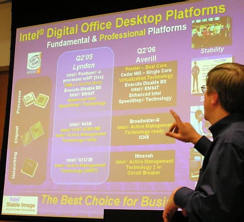 Индустрия сперва фокусировалась на производительности. Теперь же в фокусе «usage oriented сomputing» (вычисления, ориентированные на пользователя) и соотношение цена+возможности на ватт (Price/Capability per Watt), а не price/performance/watt. Двадцать лет инноваций в полупроводниковой промышленности и технологии прошло — теперь наступают 20 лет поиска, куда огромные наработки можно было бы применить, сделать технику более управляемой (manageability). Причем уже до 5 миллиардов долларов тратится на безопасность IT-систем — это половина всех затрат в данном сегменте. Отметив, что рынок процессоров Intanium сейчас — наиболее быстрорастущий среди серверных (Sun недавно перешла на использование этих процессоров Intel, а остальные 8 крупнейших производителей серверов, включая Fujitsu-Siemens, перешли еще раньше), «генералы» Enterprise-направлений Intel подчеркнули, что с 1996 года было поставлено более 30 миллионов серверов на процессорах Intel. А в родмэпе enterprise-систем и платформ корпорации появились теперь и системы на Pentium 4 и Pentium D — с чипсетом E7221 и будущими для двуядерных процессоров! «Дорожная карта» (как теперь модно выражаться) на двухъядерные процессоры Intel утверждает, что в 2006 году 70% проданных настольных и мобильных процессоров и 85% серверных процессоров будут двухъядерными, а в 2007 году таковыми станут 100% серверных и 90% потребительских процессоров этой корпорации!