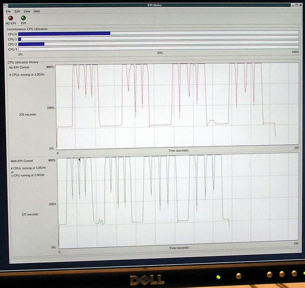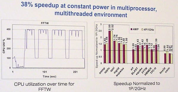 Применение специального анализа загрузки системы работой и оптимизации частоты работы процессоров многопроцессорной системы позволяет увеличить производительности системы на 38% при неизменной мощности потребления (и тепловыделения) в многопоточном окружении.