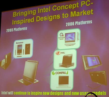 и в плане больших прибылей не столь интересна для Intel, и так владеющей более 80% рынка микропроцессоров. Однако из-за того, что изделия Apple зачастую идут впереди отрасли по концепции и дизайну и популярны именно в этом качестве, Intel было бы крайне интересно поучаствовать и в этом бизнесе. Кстати, в этой связи Intel на Research Day 2005 тоже было, чем похвастаться, представив несколько новых концепт-компьютеров с расширенной нетрадиционными функциональностью и дизайном.)