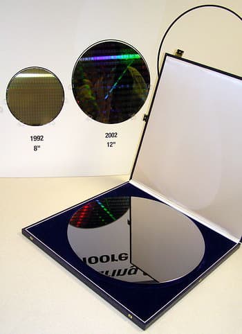 И такие «здоровенные» пластины уже демонстрируются — в сравнении даже с 200- и 300-мм «вафлями» (так на жаргоне называют кремневые пластины) будущие выглядят просто громадными. Разумеется, такое производство будет полностью автоматизировано (вручную перетаскивать такие пластины негоже), а экономическая выгода от увеличения диаметра существенно возрастет.