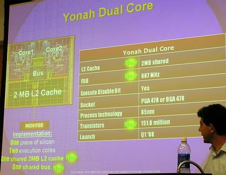 Денни обнародовал также некоторые новые сведения о будущем процессоре Yonah, который должен появиться в начале 2006 года в рамках новой мобильной платформы Napa. Два ядра этого процессора будут иметь общую для обоих ядер (в отличие от текущих двухъядерных процессоров Intel и AMD) кэш-память второго уровня объемом 2 Мбайт (с улучшенным механизмом энергосбережения) и общий же контроллер системной шины QPB с частотой 667 МГц. Он будет выпускаться по 65-нм технологии в форм-факторах PGA 478 и BGA 479, содержать 151,6 млн. транзисторов, поддерживать технологию XD-bit и, судя по предварительной информации, поддерживать некоторые механизмы прямого взаимодействия ядер между собой.