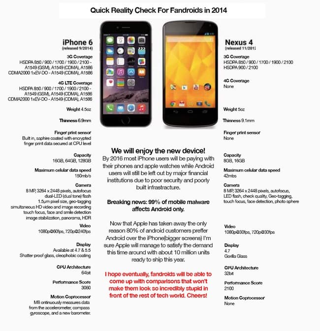 Анонс новых продуктов Apple во время осенней презентации 2014 года предсказуемо вызвал ожесточенные бои по всему интернету, в ходе которых больше всего досталось, как обычно, iPhone — потому что он рассматривается и самой Apple, и аудиторией в качестве флагмана. Лейтмотивом обсуждений стало то, что представленные новинки имеют не рекордные характеристики, поэтому «всё пропало» и пальма первенства безнадежно утеряна. Накал страстей был столь велик, что многие издания посчитали своим долгом выпустить краткие колонки из серии «всё не так плохо!» еще до начала продаж.