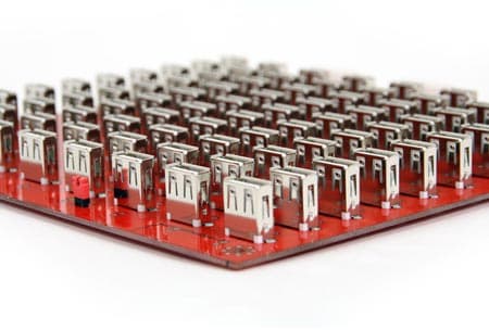 Интересный USB-концентратор был замечен в ленте новостей: Thanko выпустила разветвитель с 80 разъемами USB на одной плате, служащими для зарядки мобильных устройств. Поле с разъемами подключается к внешнему блоку питания, а его размеры составляют всего лишь 170 х 105 х 38 мм. Цена немного кусается: 165 долларов за 80 портов.