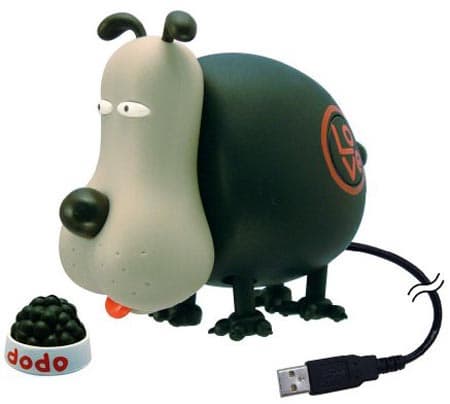 В продаже появился USB-пес Dodobongo. Как только кто-нибудь приблизится к собаке, она начинает передвигаться, лаять и вращать головой из стороны в сторону, а на ее щеках появляется румянец. Если устройство оставить надолго в одиночестве, пес начинает периодически подавать голос. В комплект поставки входит миска с кормом, которую можно приспособить на роль подставки для небольшой таблички, например, визитной карточки.
