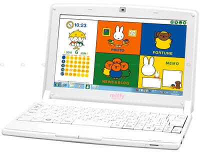 Onkyo выпустила весьма милую модель ноутбука для детей: Miffy Netbook. Аппаратная начинка включает процессор Intel Atom N450 (1,66 ГГц), 1 ГБ оперативной памяти, жесткий диск объемом 160 ГБ, экран с диагональю 10 дюймов разрешением 1024 х 600 пикселей, модуль беспроводной связи Wi-Fi. Весит нетбук 1,1 кг.