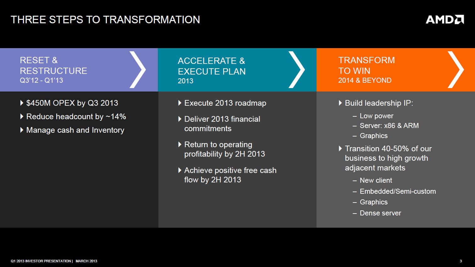 В самом начале месяца в Сети появилась презентация, подготовленная AMD для встречи с инвесторами. Из нее стало известно, что AMD планирует на 2013 год отход от «традиционных вычислений» и возврат к прибыли. Вернуться к операционной прибыли и положительному потоку свободных денежных средств в компании рассчитывают во втором полугодии. Этому будет предшествовать осуществление реформ, направленных на уменьшение зависимости от рынка традиционных ПК и адаптацию структуры бизнеса к новым условиям. В результате реструктуризации к третьему кварталу 2013 года ожидается уменьшение операционных расходов до 450 млн. долларов.