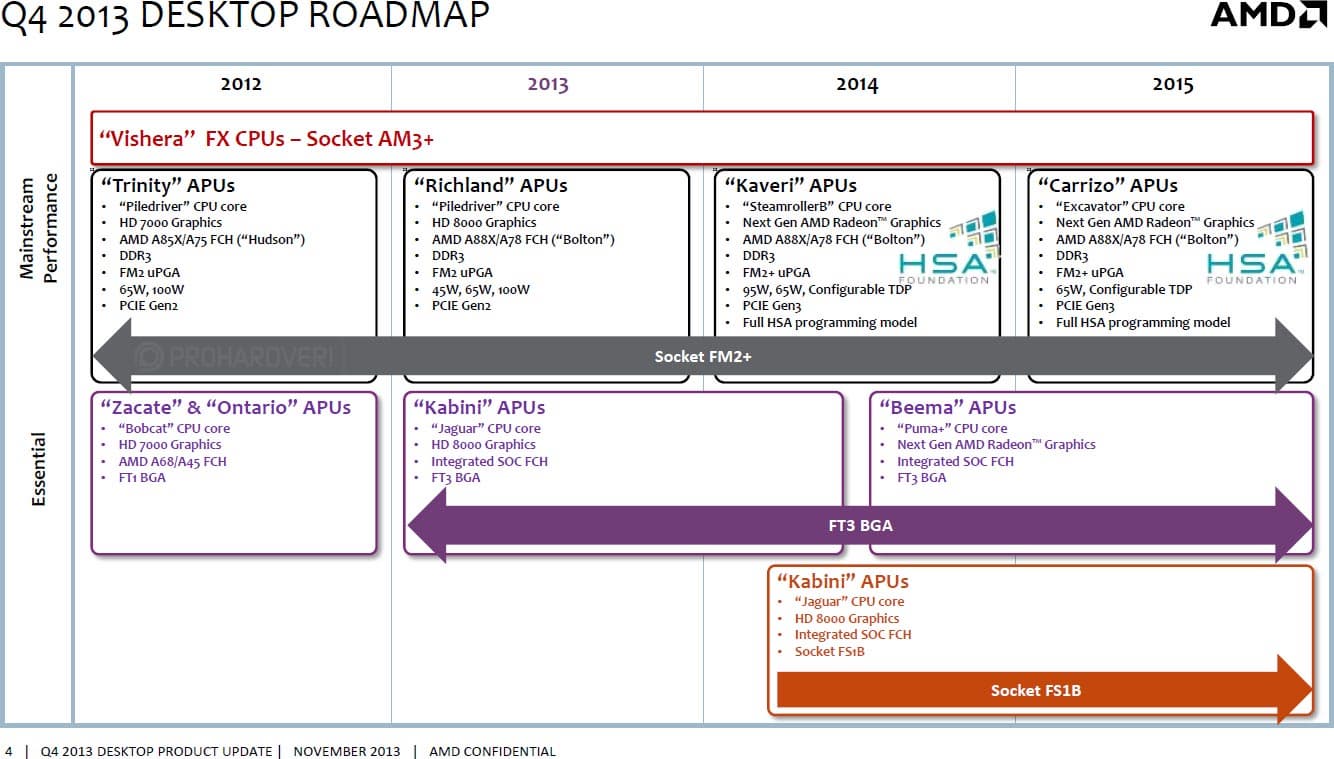 Что касается настольных APU Kaveri, за ними последуют APU Carrizo, которые будут предложены в вариантах с TDP 65 Вт и конфигурируемым TDP. Эти гибридные процессоры на процессорном ядре Excavator унаследуют у Kaveri значительную часть своих качеств, включая интегрированный GPU Radeon, контроллер памяти DDR3, поддержку PCIe Gen3 и исполнение FM2+. Они будут полностью соответствовать программной модели HSA. Появление APU Carrizo, рассчитанных на использование совместно с чипсетом AMD88X/A78 FCH (Bolton), намечено на 2015 год.