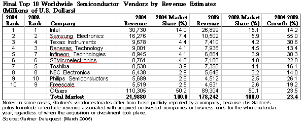 Итак, согласно окончательным данным Gartner, в 2004 году было продано полупроводников в сумме на 219,9 млрд. долларов, что на 23,4% больше, чем в 2003 году. Лидером рынка остается Intel (30,7 млрд. долларов), но ее доходы выросли всего на 14,2%, в то время как доходы Samsung (16,2 млрд.) увеличились на 55%.