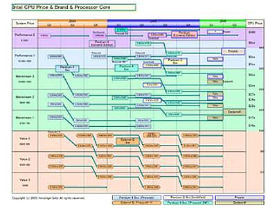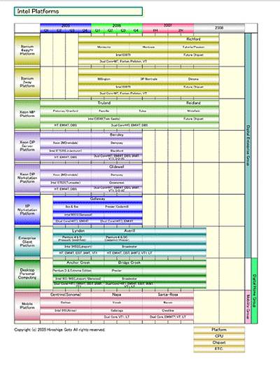 Наконец, коснемся платформ компании. По убеждению руководства Intel, конечным пользователям намного удобнее следить за выпуском платформ, а не отдельных процессоров и чипсетов, из которых эти платформы состоят. Но, как мы знаем, между анонсами таких компонентов всегда есть некий промежуток времени, поэтому платформа, как единое целое, будет считаться выпущенной только после выпуска ее последнего недостающего компонента. Например, на схеме видно, что Presler/Cedarmill ожидаются в первом квартале 2006 г., а чипсет Broadwater — только во втором квартале того же года. Следовательно, платформы Averill и Bridge Creek также можно будет увидеть только во втором квартале 2006 года.
