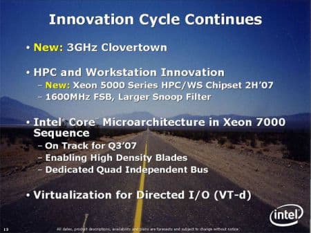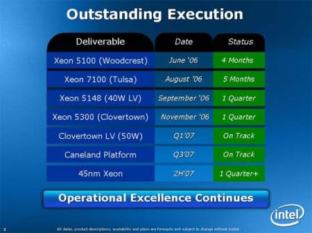 Также обновленные планы производителя говорят о том, что первые партии настольных процессоров по новым нормам также будут выпущены к концу текущего года. Лишь для мобильных продуктов всё также датой выхода значится 2008 год. Принцип присвоения наименований новым моделям останется неизменным — всё также будут использоваться серии Xeon 5100 (двухъядерные, кодовое имя Wolfdale) и 5300 (четырёхъядерные, Harpertown).