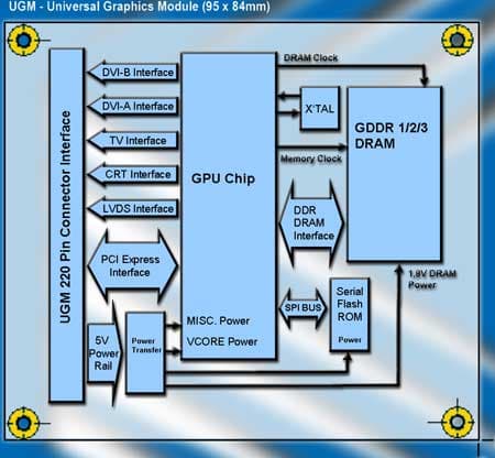Компании Kontron и XGI Technology представили первую версию стандарта встраиваемых графических плат — UGM 1.0 (Universal Graphics Module). Согласно спецификации, размеры модуля приняты равными 84×95 мм, и сам он не будет иметь разъемов для подключения устройств отображения.