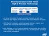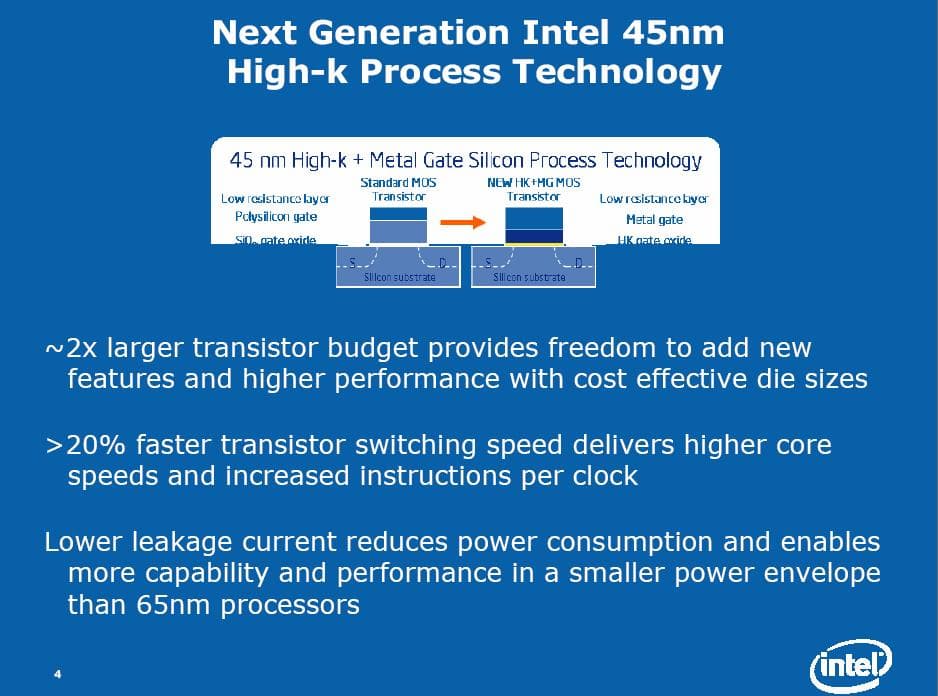 Итак, мы уже знали из предыдущей презентации, что Penryn будет отличаться от Conroe новыми материалами, используемыми в качестве диэлектрика — будет произведен отказ от двуокиси кремния, которая используется Intel последние десятилетия, в пользу диэлектриков с большой диэлектрической постоянной (high-k). Это позволит отказаться от затворов из поликристаллического кремния и использовать металлические. Лишь один этот шаг способен на 20% увеличить скорость переключения транзисторов и, как следствие, повысить быстродействие процессоров. Гелсингер, помимо того, заявил, что снижение энергопотребления от внедрения нового техпроцесса составит до 30%.