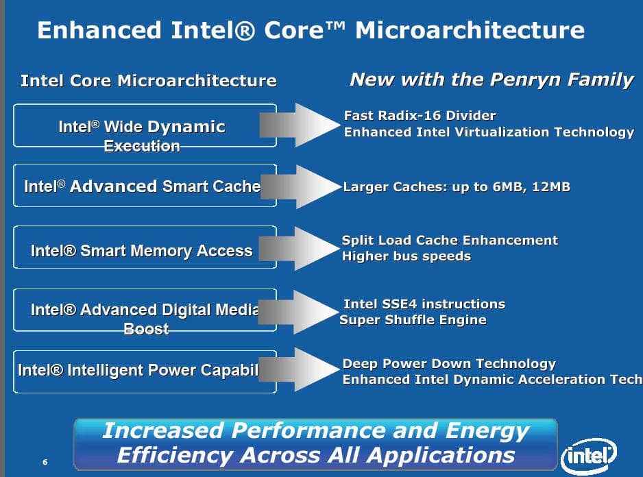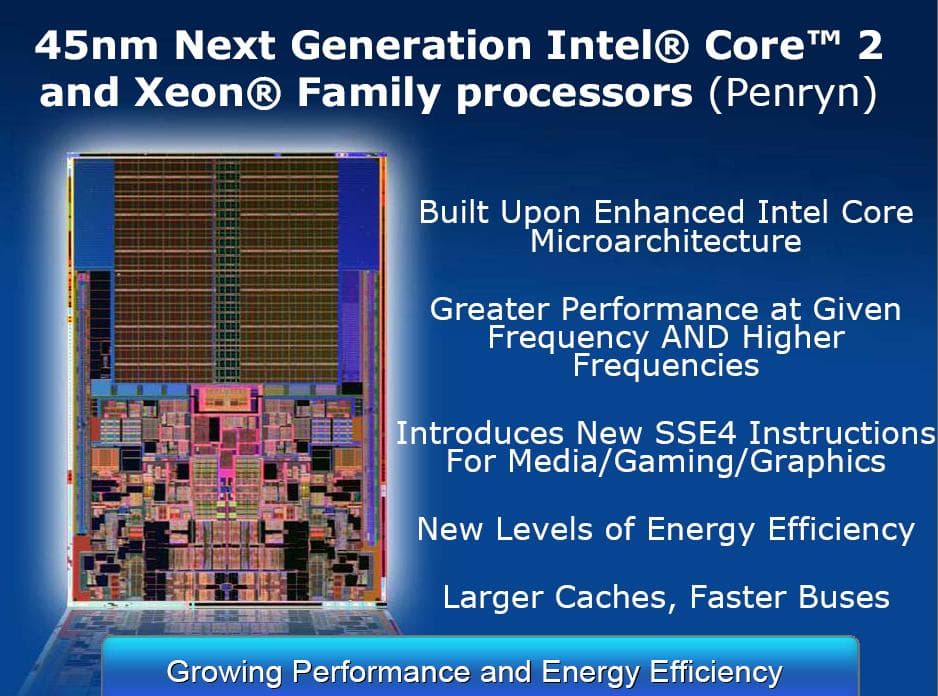 Penryn будет вдвое быстрее, чем Core 2, выполнять операции деления, обрабатывая 4, а не 2 операции за такт. Частоты системной шины в новых процессорах достигнут 1600 МГц. Впрочем, такое значение было подтверждено Гелсингером лишь для семейства Xeon.