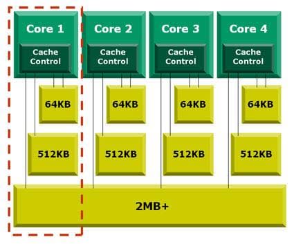 Кэш-память в К10 будет представлена тремя уровнями: L1, L2 и L3, где L3 — общая кэш-память для каждого из ядер, а L1 и L2 у каждого ядра будет своя.