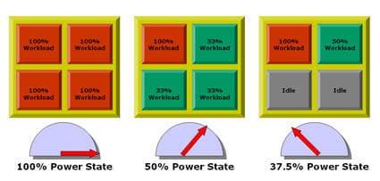 K10 будет иметь возможность определять частоту для каждого из ядер в отдельности. В поколении К8 (как и в процессорах Intel Core 2) частота задавалась одна и общая — P-state менялись синхронно. Т.е. в случае задач с интенсивными вычислениями для всех ядер задавалось максимально высокое значение P-state. Процессоры поколения K10 смогут варьировать частоту ядер. В зависимости от общей нагрузки каждое из ядер будет иметь свою независимую рабочую частоту.