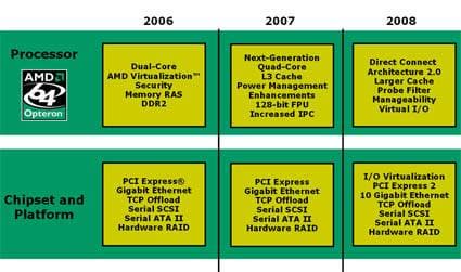 Недавно AMD представила на рынке несколько моделей серверных процессоров семейства Opteron (2222 SE и 8222 SE), которые, как она полагает, должны будут успешно конкурировать с Intel Xeon 5100 series, поскольку опережают их согласно тестам SPECint_rate_2006, SPECint_rate2006 и SPECompM2001 примерно на 24%.