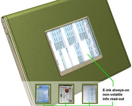 Приводимые изображения говорят о наличии довольно внушительного по размерам вспомогательного дисплея. Он будет использовать технологию «электронных чернил», что позволит не тратить энергию в те моменты, когда изображение не обновляется, а это и есть основной режим работы такого дисплея, на котором удобно просматривать электронные письма, заметки, события календаря и т.п. Характерно, что панель, в которой находится дополнительный экран, является съёмной.