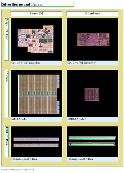Ядро Silverthorne будет вчетверо меньше ядра Penryn (также будет производиться по 45-нм нормам), и размер готового процессора в сборе будет равен половине размера процессора на ядре Penryn. Silverthorne будет насчитывать 10 млн. транзисторов и иметь 512 Кбайт кэш-памяти второго уровня.