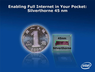 Малютка Silverthorne, который будет производиться по 45-нм техпроцессу и будет обладать весьма скромными габаритами, должен будет занять своё место в процессорной линейке LPIA (Low Power Intel Architecture).