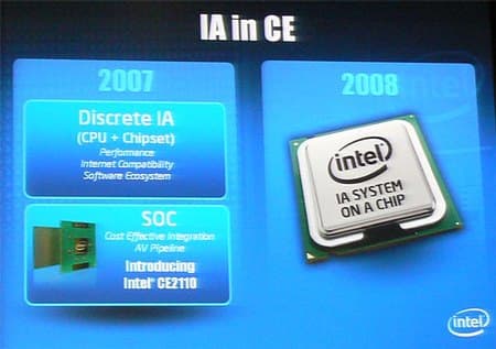 Говоря о решениях для мобильных устройств, нельзя пройти мимо представленного в ходе Пекинского форума Intel для разработчиков (IDF) интегрированного процессора мультимедиа, предназначенного для интеграции в такие устройства бытовой электроники, как настольные приставки и сетевые проигрыватели мультимедиа.