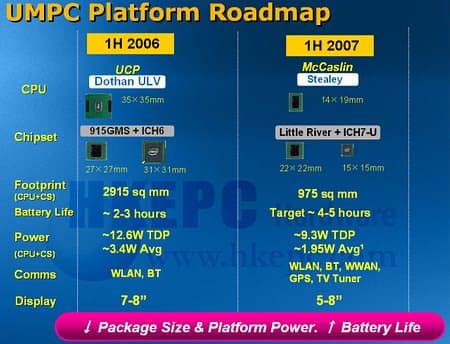 В этом же году платформу для ультрамобильных ПК будет представлять McCaslin с процессором Stealey и чипсетом 945GU (Little River + ICH7-U), а уже в следующем году им придет на смену Silverthorne в составе Menlow. Как показано на слайдах, развитие ультрамобильной платформы Intel предполагает дальнейшее увеличение функциональности и времени работы от батарей при том, что будет сокращаться энергопотребление процессоров и чипсетов, а размеры используемых экранов сохранятся теми же.