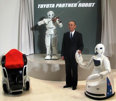 Корпорация Toyota Motor представила двух роботов: первый имеет очень гибкие пальцы, что позволяет ему играть на скрипке, а второй служит для перемещения пользователя в пространстве. Робот-скрипач умеет не только музицировать, но и выполнять более полезные функции, в частности, ухаживать за больными и престарелыми людьми. Робот, транспортирующий пользователя, имеет два колеса и способен развивать скорость до 6 км/ч. Конструкция подвески позволяет сохранять устойчивое горизонтальное положение сидения даже в те моменты, когда робот одним из колес преодолевает препятствие.