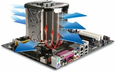 Тепло от процессора отводят сразу пять тепловых трубок, что вкупе с изогнутыми для увеличения площади рассеивания ребрами радиатора позволяет, по словам производителя, охлаждать разогнанные процессоры, выделяющие 130-160 Вт тепла.