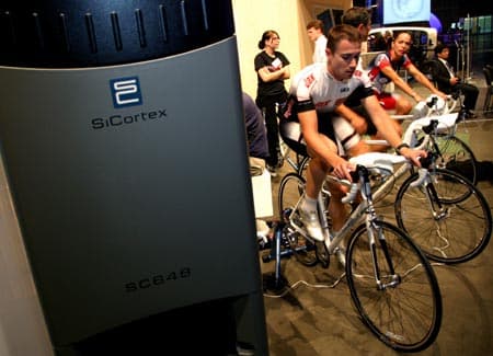 Созданный в компании SiCortex кластер, работающий под управлением ОС Linux, в ходе демонстрации, которая прошла в Лос-Анджелесе, питался электричеством, вырабатываемым командой велосипедистов.