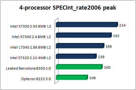 Новые процессоры на 50% превосходят своих двухъядерных предшественников, процессоры Dual-Core AMD Opteron. Такие данные получены сравнением результатов тестов SPECint_rate2006 и SPECfp_rate2006 для Dual-Core AMD Opteron Model 2222 и Quad-Core AMD Opteron Model 2350.
