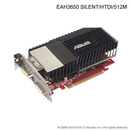 ASUS представила видеокарты EAH3650 SILENT/HTDI/512M и EAH3650 SILENT/HTDI/256M. В новинках применен фирменный радиатор V-Cool Heatsink, получивший свое название за V-образную форму ребер радиатора, обеспечивающую максимальную площадь рассеивания тепла. Частота GPU 725 МГц, объём ОЗУ 512/256 МБ, частота памяти 1400/1600 МГц DDR3, интерфейс доступа к памяти 128-битный. Выходы: DVI-I х 2, HDMI через адаптер, D-Sub, HDTV-out.