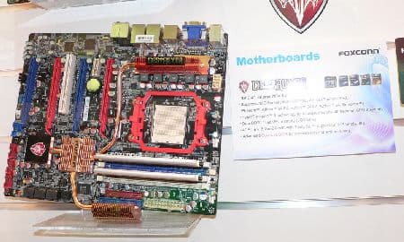 Компания FOXCONN привлекла посетителей CeBIT разнообразием экспонатов. Среди системных плат выделялись плата на nForce 780a с поддержкой 3-Way SLI, плата на X48 с водяным охлаждением чипсета, плата в расширенном ATX-формате с общим количеством до 10 слотов PCI/PCIe.