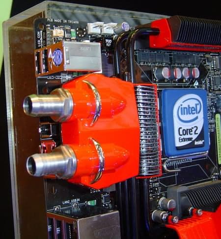Показанная на CeBIT системная плата ASUS (предположительно, Maximus Extreme на Intel Х38), рассчитанная на использование опытными пользователями-энтузиастами, обладает незаурядной системой охлаждения, которая, подобно продвинутым продуктам с системой охлаждения на базе тепловых трубок, является замкнутой (ее элементы соединены между собой) и использует в качестве ОЖ воду. Ватерблок рассчитан на использование внешней СВО (системы водяного охлаждения), а не внутренней, размещающейся внутри корпуса ПК.