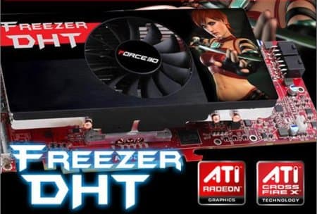 Force3D объявила о выпуске графического акселератора Radeon HD 4870 с оригинальной системой охлаждения Freezer DHT (Direct Heatpipe Touch). Тепловые трубки кулера (всего их три, каждая диаметром 6 мм) непосредственно соприкасаются с графическим процессором, увеличивая эффективность теплоотвода и снижая температуру GPU. Компания применила в кулере 80-мм вентилятор собственной разработки. Он вращается на скорости 2500 об./мин±10%. Воздушный поток при этом достигает 38 CFM, а уровень шума не превышает весьма скромных 25 дБа. Разгонять Force3D Radeon HD 4870 производитель не стал, предоставив такую возможность покупателям. Карта работает на частотах 750 МГц для GPU и 3600 МГц для памяти GDDR5.