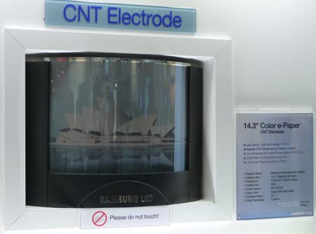 Samsung Electronics показала первый в мире цветной активноматричный электрофоретический дисплей (EPD) на основе нанотрубок. Дисплей, относящийся к категории «электронной бумаги» (e-paper) размером 14,3″ по диагонали стал результатом совместной работы специалистов Samsung Electronics и Unidym. К достоинствам EPD относится низкое энергопотребление и хорошая видимость при ярком свете. Сочетание этих качеств делает EPD очень привлекательной технологией для карманных и мобильных устройств. Возможность формирования дисплея на тонкой, гибкой основе расширяет круг применений. В конструкции EPD отсутствует подсветка, а затраты энергии возникают только при смене изображения, что радикально снижает энергопотребление.