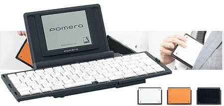 Складная клавиатура была представлена японской Jim King. Ее Pomera DM10 весит 370 граммов и имеет размеры 145×100×30 мм. Особенностью изделия, полностью именуемого как Digital Memo «POMERA» DM10, является то, что POMERA DM10 позволяет создавать цифровые заметки. Быстро и удобно, поскольку для этого не требуется ожидание загрузки ОС компьютера, запуск ПО для работы с текстом и т. п. Устройство является складной клавиатурой с 4″ ЖК-монитором с разрешением VGA (640×480 точек). Время автономной работы POMERA DM10 составляет 60 часов, что достигается за счет двух ААА-батарей.