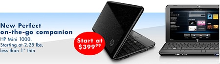 Компания Hewlett-Packard (HP) опубликовала информацию о новой модели нетбука, именуемой как Mini 1000. HP Mini 1000 весит всего около 1 кг, его толщина чуть меньше одного дюйма (~2,5 см), а диагональ экрана — 10″. Стоимость нетбука HP Mini 1000 — $399.