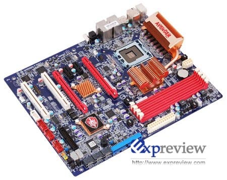 Для построения самых быстрых систем на базе Penryn предназначена плата Foxconn Avenger. Плата не похожа на аналогичные решения уже с первого взгляда. Процессорный разъём LGA775 развернут на 90 градусов, а чипсет располагается между ним и разъёмами памяти, что сокращает расстояние между ними при обмене данными. Между разъёмами PCI Express можно заметить чип PLX, такой же, как используется на решениях Radeon HD 4870 X2 как мост PCI Express. Благодаря его использованию Avenger обеспечивает полноценные интерфейсы PCI Express x16, а не x8 как на других платах, использующих чипсет P45.