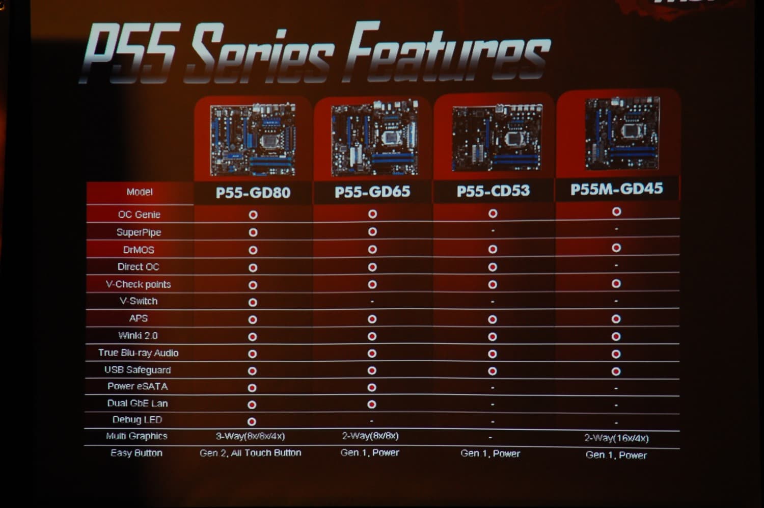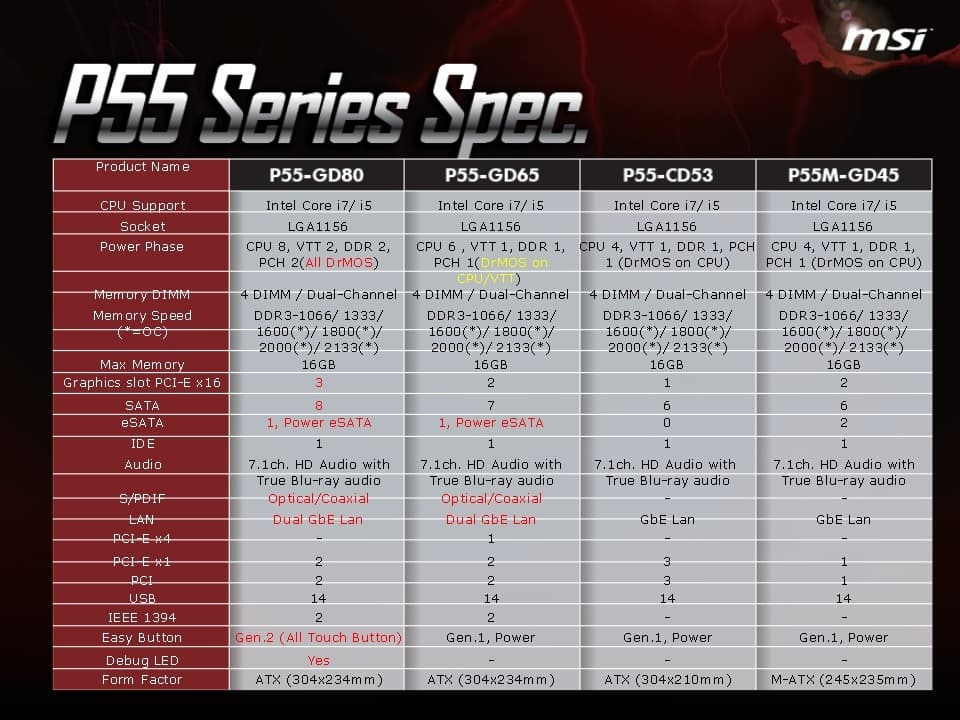 После рассказа о всем множестве нововведений, в заключении презентации были представлены подробные характеристики каждой из четырех моделей материнских плат MSI P55:
