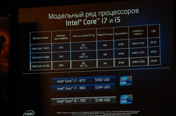 Но началось все с небольшого рассказа представительницы Intel о трех упомянутых выше процессорах. Для начала было проведено сравнение нескольких процессоров предыдущего и нового поколения. Наиболее интересным оказалось сопоставление «топового» процессора линейки Core i7 Extreme и представителя нового поколения, Core i7 860. Согласно презентации Intel, c технической точки зрения первый продукт совсем немного уступает. Но его цена составляет около тысячи долларов, а процессор Core i7 860 стоит около трехсот долларов. Более, чем трехкратная разница в цене производит впечатление.
